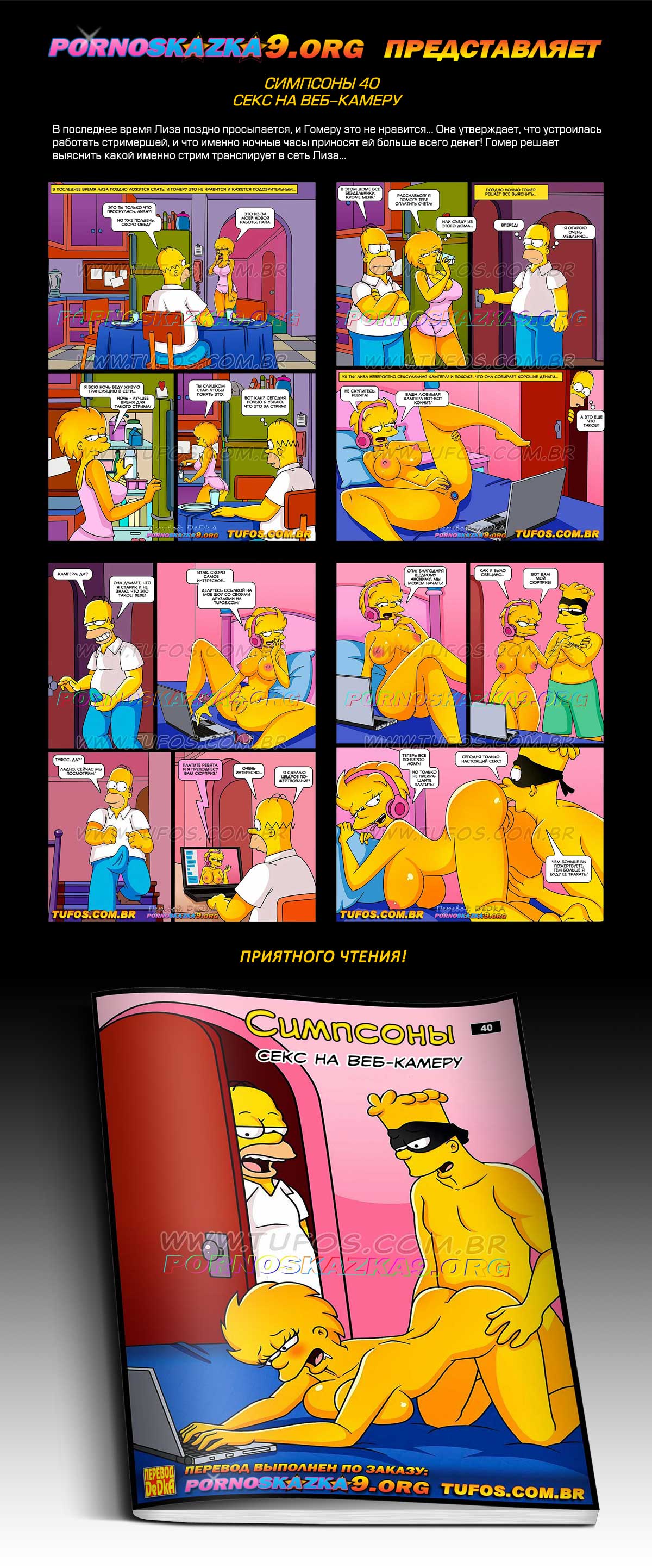 Порно комикс «Симпсоны. Часть 40. Секс на веб-камеру.» В последнее время Лиза поздно просыпается, и Гомеру это не нравится… Она утверждает, что устроилась работать стримершей, и что именно ночные часы приносят ей больше всего денег! Гомер решает выяснить какой именно стрим транслирует в сеть Лиза…